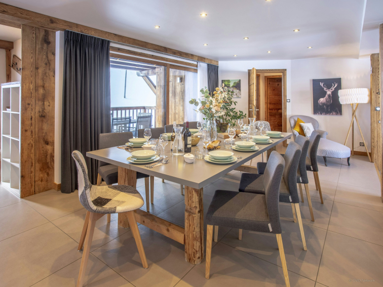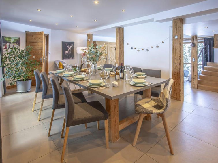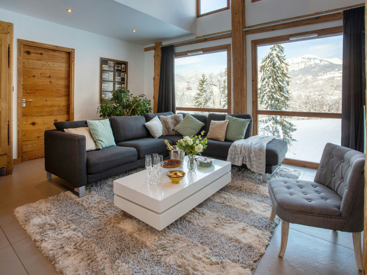 The living room will be the perfect place to relax after a busy day in the mountains - light pours in through the double-height windows and there is a covered terrace and hot tub. The kitchen is spacious enough to cook up some good food, and the breakfast bar is ideal for kids' meals. The dining area is separated from the living area by a central fireplace, making both areas cozy!