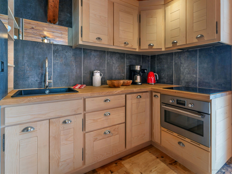 The living area is divided into a comfortable lounge, with dining table, armchairs and wood-burning stove, and a brand-new kitchen, equipped with all the appliances and utensils you'll need during your stay. Several French windows illuminate this room and open onto a furnished terrace, where you can also enjoy your meals in fine weather.