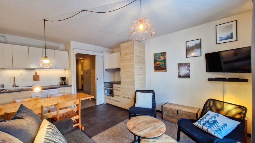 2-room apartment + 40m2 comfort cabin on 1st floor, south-facing balcony, panoramic view of the ski area.