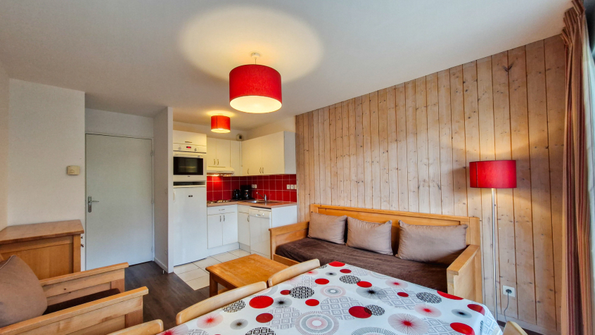 - Cuisine ouverte avec plaques vitrocéramiques, réfrigérateur, four multifonction et lave-vaisselle