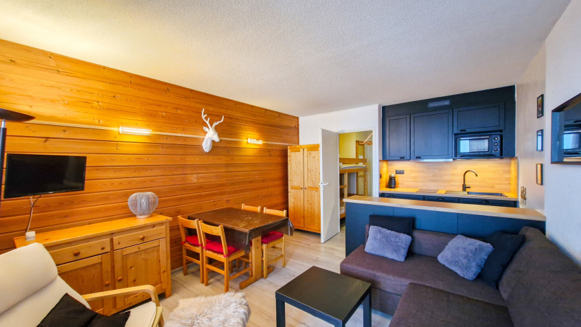 - Cuisine ouverte avec 2 plaques vitrocéramiques, four, lave-vaisselle et micro-onde