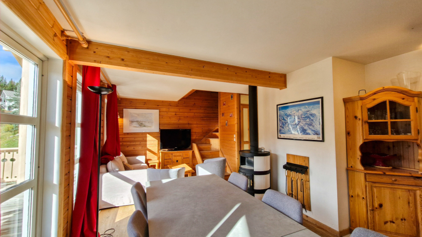 Magnifique quartier de chalets scandinaves avec quelques commerces situé au Hameau de Flaine. Piste bleue à proximité pour atteindre les remontées mécaniques et skibus gratuit pour accéder au départ des pistes et rassemblement d'écoles de ski de Flaine Forêt.