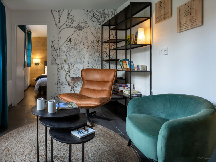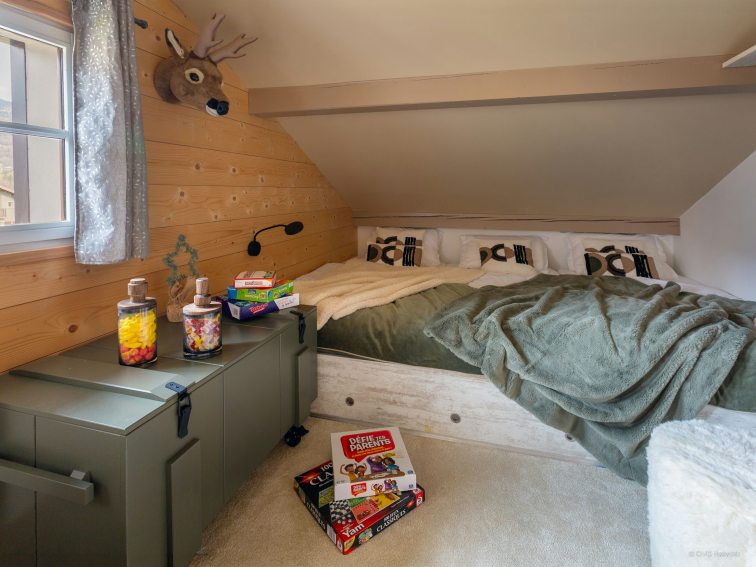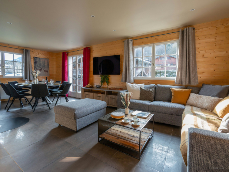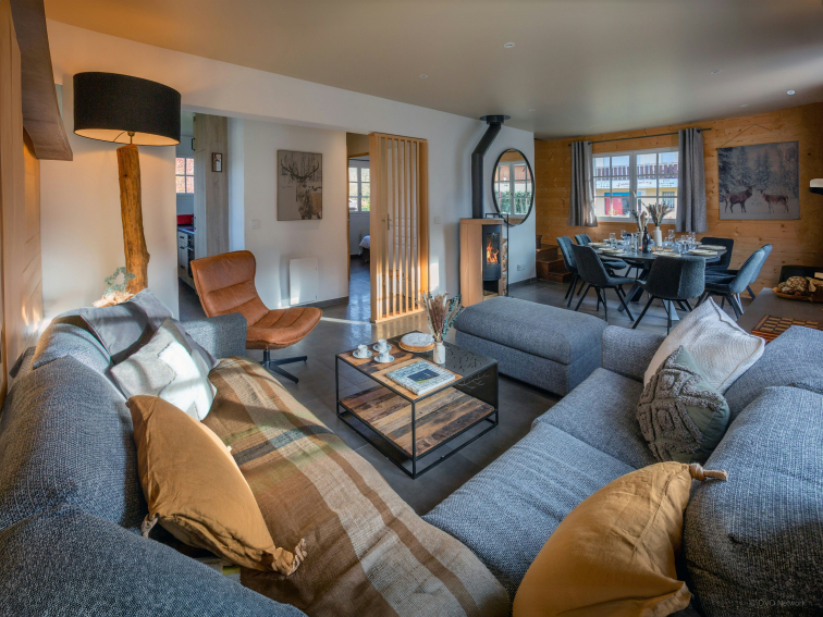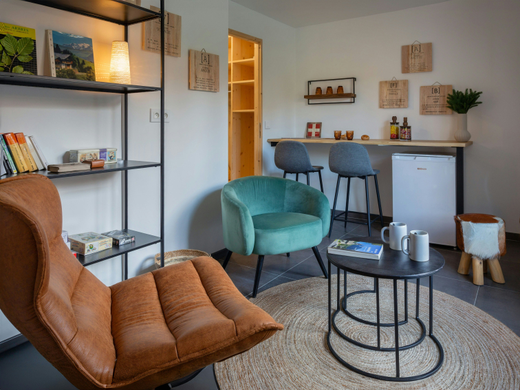 Au premier étage se trouvent la cuisine lumineuse et le salon, qui est meublé d’un canapé en L, d'une télévision, d'une table à manger et d’un poêle à bois, créant une atmosphère conviviale. Ce salon ouvre sur une terrasse orientée sud, avec petite table et barbecue. Le rez-de-chaussée dispose d’une agréable salle de lecture, équipée de jeux de société et d'un réfrigérateur, offrant un espace idéal pour se détendre après une journée d’activités.