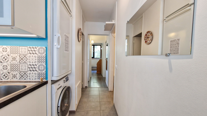 - Coin cuisine avec plaques vitrocéramiques, hotte, refrigérateur, congélateur, four, lave-vaisselle, micro-onde, cafetière Nespresso, lave-inge séchant