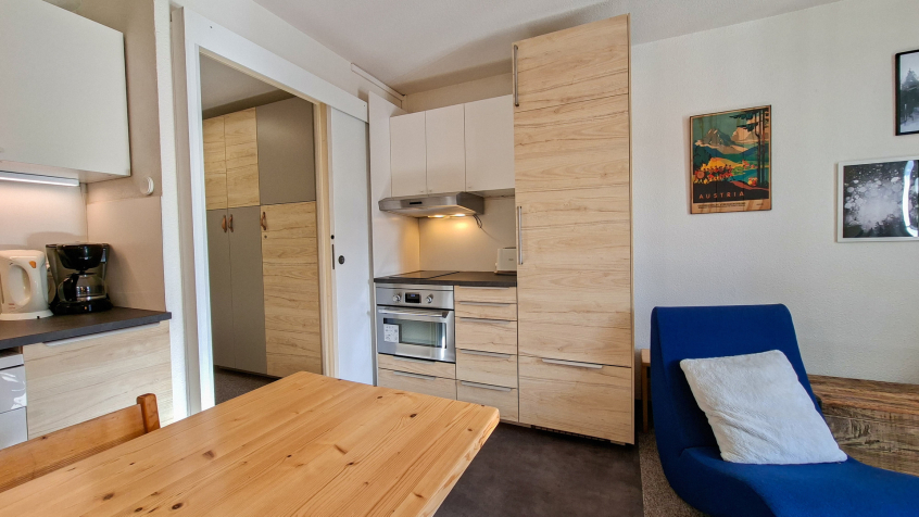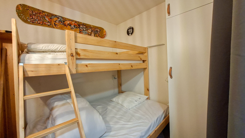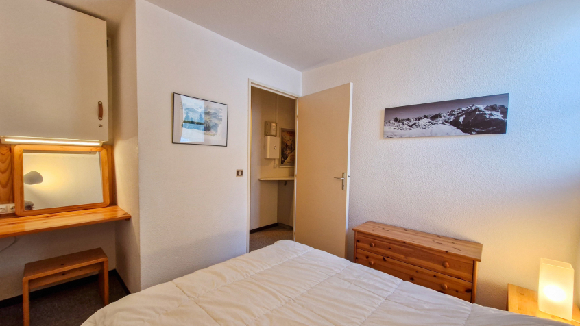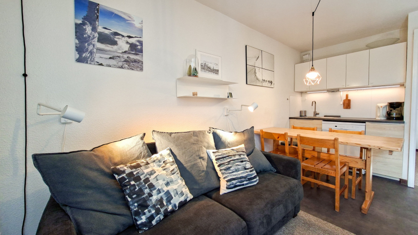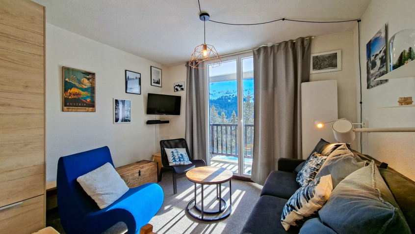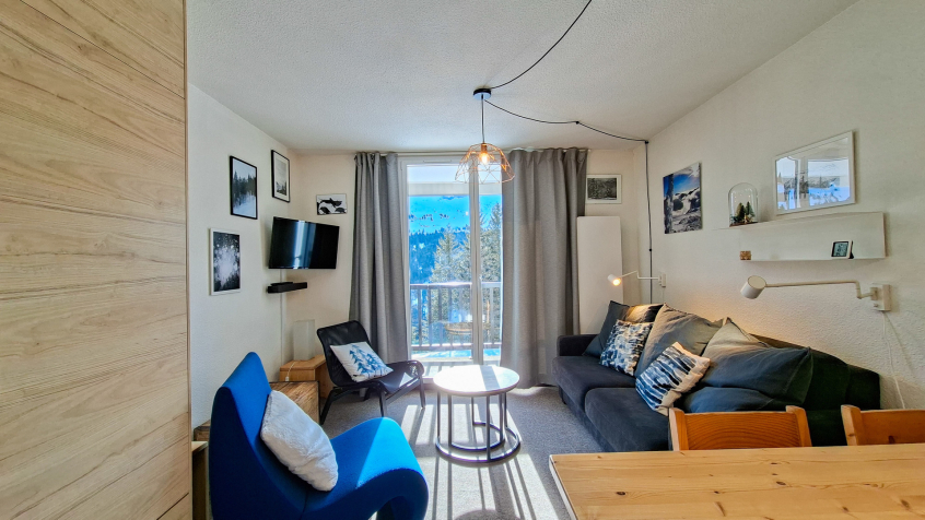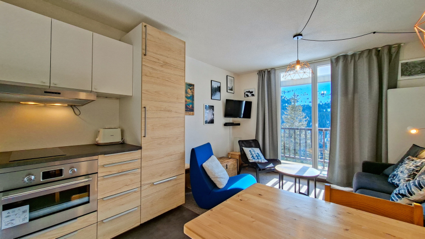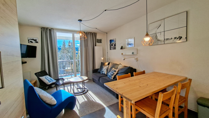 Appartement 2 pièces + cabine confort 40m2 au 1er étage balcon Sud, vue panoramique sur le domaine skiable (descendre de 2 étages en entrant dans la résidence, pas d'ascenseur)