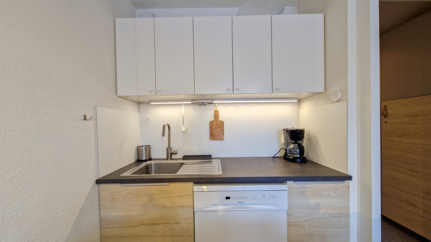 - Coin cuisine avec réfrigérateur, 2 plaques vitrocéramiques, four multi-fonction, hotte, lave-vaisselle