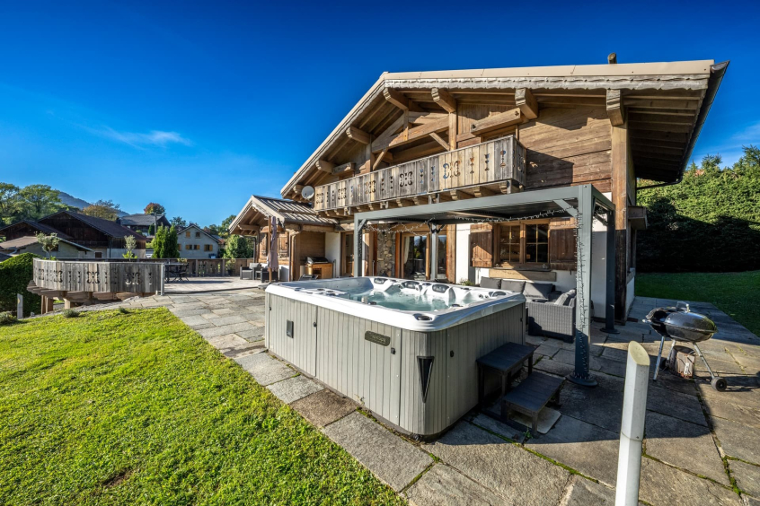 Grande terrasse propice à la détente avec jacuzzi et chaises longues. Salon de jardin couvert avec canapé et fauteuils. Espace repas extérieur avec table et chaises ainsi qu'un barbecue.